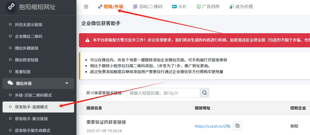 选择【短链/外链】-【获客助手-直跳模式】,这里新建链接,详细操作步骤